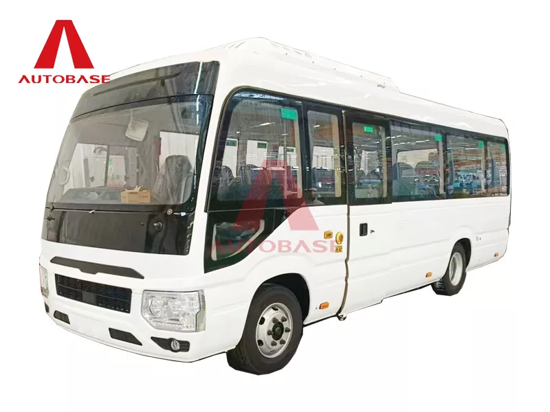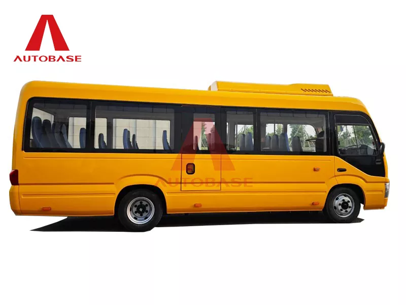 A: バスは全長7,250mm(7.2m)、全幅2,240mmのコンパクトでありながら広々としたデザインです。 2+1の座席レイアウトを採用し、ドライバーを加えた合計22名の乗客が乗車できます。